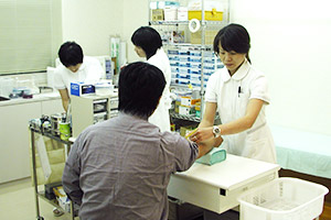 処置室という言葉自体、処置されるという負のイメージがあって本当は別の名前がないかと考えたのですが、それに代わる適当な名称も思いつかずそのままの名前にしました。でも、こここそ看護師さんたちがその本領を発揮する場所であり、それぞれの個性も生かして患者さんに接する場です。採血、注射、点滴等の治療はもちろん、医師がカバーしきれなかった悩みや苦しみや痛み等、看護師さんが受け止めてくれるはずです。